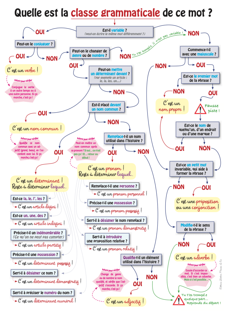 Précisément pour les aider à se poser les bonnes questions, les professeurs de français du collège ont élaboré un petit schéma ludique et (quasiment) imparable : dans un texte, prenez n’importe quel mot et demandez-vous quelle est sa classe grammaticale, en vous posant ces questions-là. BIM, vous avez la réponse ! Tant que cela ne marche pas à 100 %… recommencez !